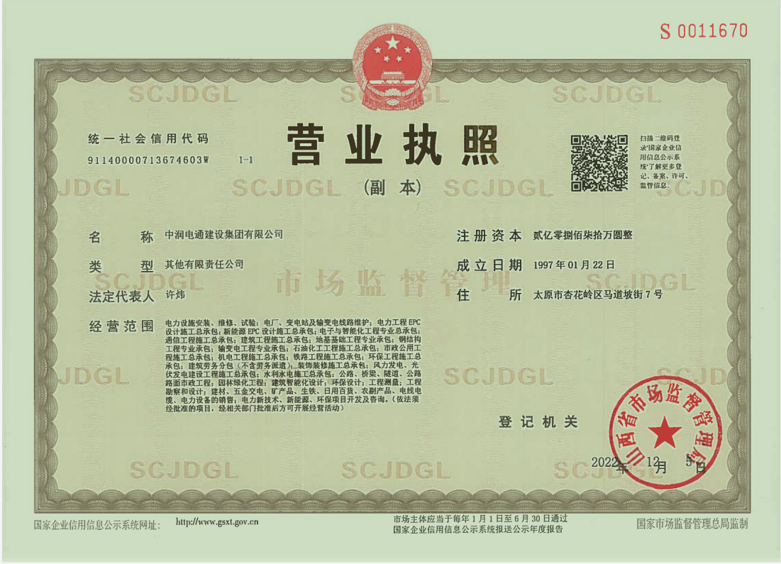 中潤電通建設集團有限公司(原山西電通電力安裝有限責任公司),于1997年1月22日正式注冊成立,2022年12月5日完成更名升級,注冊資本20870萬元,總部坐落于山西省太原市,是一家深耕電力與綜合工程領域,集設計、施工、運維、勘察于一體的大型綜合性建設集團,歷經近30年發展,已實現從單一電力安裝向多領域綜合服務的戰略轉型。